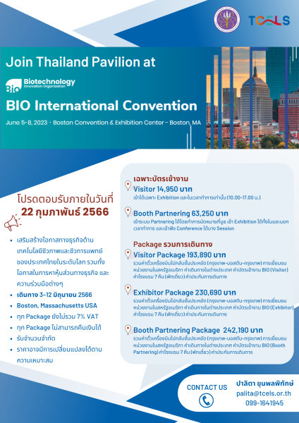 ศูนย์ความเป็นเลิศด้านชีววิทยาศาสตร์ (องค์การมหาชน) หรือ ทีเซลส์ (TCELS) กระทรวงการอุดมศึกษา วิทยาศาสตร์ วิจัยและนวัตกรรม (อว.) ขอเชิญชวนผู้ประกอบการ บริษัทเอกชน หน่วยงานภาครัฐและภาพเอกชน ร่วมเดินทางเปิดโลกธุรกิจด้านเทคโนโลยีชีวภาพและชีวการแพทย์ของประเทศไทยสู่ระดับโลกในงาน BIO International Convention 2023 จัดขึ้นระหว่างวันที่ 5-8 มิถุนายน 2566 ณ เมืองบอสตัน (BOSTON), รัฐแมสซาชูเซตส์ (MASSACHUSETTS) ประเทศสหรัฐอเมริกา เพื่อเสริมสร้างโอกาสทางธุรกิจด้านเทคโนโลยีชีวภาพและชีวการแพทย์ของประเทศไทยสู่ระดับโลก เปิดโอกาสในการหาหุ้นส่วนทางธุรกิจ และเกิดเครือข่ายความร่วมมือสร้างโอกาสในการเข้าถึงเทคโนโลยี การวิจัยและการพัฒนาองค์ความรู้ในการสร้างนวัตกรรมใหม่ๆ พร้อมทั้งได้เรียนรู้กระแสพัฒนา และทิศทางขององค์ความรู้และเทคโนโลยี ด้านเทคโนโลยีชีวภาพและชีวการแพทย์ โดยเดินทางระหว่างวันที่ 3-12 มิถุนายน 2566