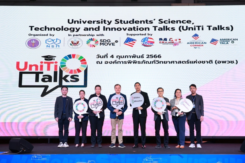 องค์การพิพิธภัณฑ์วิทยาศาสตร์แห่งชาติ (อพวช.) ร่วมด้วย สถานเอกอัครราชทูตสหรัฐอเมริกา ประจำประเทศไทย และศูนย์วิจัยและสนับสนุนเป้าหมายการพัฒนาที่ยั่งยืน (SDG Move) เปิดเวทีการประกวดในโครงการ University Students’ Science, Technology and Innovation Talk (UniTi Talks) ในหัวข้อ “UniTi Talks on STI for Sustainable Community ฉากทัศน์ชุมชนที่ฉันอยากเห็น ด้วยวิทยาศาสตร์ เทคโนโลยี และนวัตกรรม” เพื่อค้นหานิสิต นักศึกษา มาร่วมสร้างสังคมนักสื่อสารวิทยาศาสตร์ เพื่อสร้างแรงบันดาลใจในการนำความรู้ด้านวิทยาศาสตร์ เทคโนโลยี และนวัตกรรม มาใช้พัฒนาคุณภาพชีวิตของคนในสังคมและขับเคลื่อนชุมชนให้เกิดการเปลี่ยนแปลงอย่างยั่งยืนต่อไปในอนาคต ชิงรางวัลและทุนการศึกษารวมมูลค่ากว่า 100,000 บาท