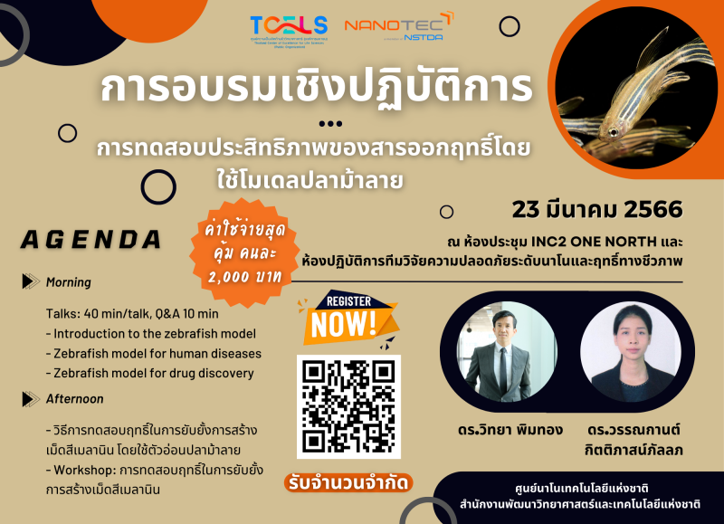 ศูนย์ความเป็นเลิศด้านชีววิทยาศาสตร์ (องค์การมหาชน) (ศลช. / TCELS) จับมือร่วมกับ ศูนย์นาโนเทคโนโลยีแห่งชาติ สำนักงานพัฒนาวิทยาศาสตร์และเทคโนโลยีแห่งชาติ (สวทช.) กระทรวงการอุดมศึกษา วิทยาศาสตร์ วิจัยและนวัตกรรม ขอเชิญชวนเข้าร่วมอบรมเชิงปฏิบัติการ "การทดสอบประสิทธิภาพของสารออกฤทธิ์ โดยใช้โมเดลปลาม้าลาย" (Efficacy testing of active compounds using the zebrafish model) เพื่อพัฒนาบุคลากรการทดสอบประสิทธิภาพ ประสิทธิผล และความปลอดภัยผลิตภัณฑ์ให้กับเครือข่ายการทดสอบความปลอดภัยและนักวิจัย ในวันพฤหัสบดีที่ 23 มีนาคม 2566 เวลา 08.00-16.30 น. ณ ห้องประชุม INC2 ONE NORTH และห้องปฏิบัติการทีมวิจัยความปลอดภัยระดับนาโนและฤทธิ์ทางชีวภาพ