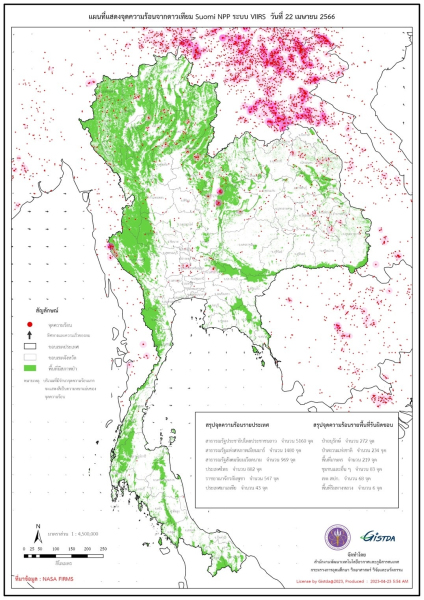 GISTDA เผยข้อมูลจากดาวเทียมซูโอมิ เอ็นพีพี (Suomi NPP) ของวันที่ 22 เมษายน 2566 ไทยพบจุดความร้อนลดลงเหลือ 882 จุด สาเหตุส่วนหนึ่งที่จุดความร้อนไทยลดลงมาจากหลายพื้นที่ตอนบนเกิดฝนตก เนื่องจากพายุฤดูร้อน ในขณะที่จุดความร้อนของประเทศเพื่อนบ้านอย่าง สปป.ลาว ครองอันดับหนึ่งอยู่ที่ 5,160 จุด, พม่า 1,480 จุด, เวียดนาม 969 จุด, กัมพูชา 547 จุด และ มาเลเซีย 43 จุด