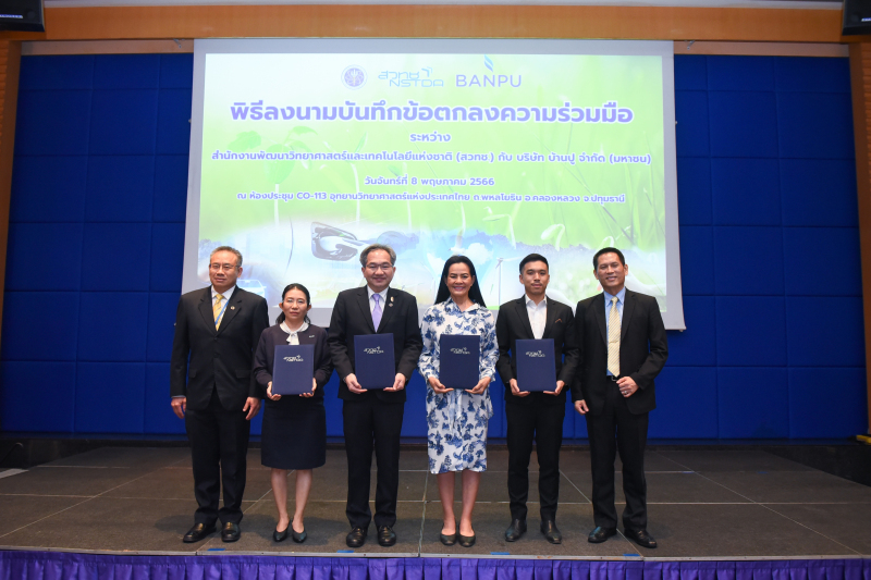 (8 พฤษภาคม 2566) ณ อุทยานวิทยาศาสตร์ประเทศไทย จ.ปทุมธานี: กระทรวงการอุดมศึกษา วิทยาศาสตร์ วิจัยและนวัตกรรม (อว.) โดย สำนักงานพัฒนาวิทยาศาสตร์และเทคโนโลยีแห่งชาติ (สวทช.) ร่วมกับบริษัท บ้านปู จำกัด (มหาชน) ลงนามบันทึกข้อตกลงความร่วมมือด้านการวิจัยและพัฒนาเพื่อส่งเสริมนวัตกรรมอุตสาหกรรมในการเร่งสู่ความเป็นกลางทางคาร์บอนร่วมกัน โดยมีศาสตราจารย์ ดร.ชูกิจ ลิมปิจำนงค์ ผู้อำนวยการ สวทช. นางสมฤดี ชัยมงคล ประธานเจ้าหน้าที่บริหาร บริษัท บ้านปู จำกัด (มหาชน) ร่วมลงนาม พร้อมด้วย นายสินนท์ ว่องกุศลกิจ ประธานเจ้าหน้าที่บริหาร บริษัท บ้านปู เน็กซ์ จำกัด ดร.ธีระชัย พรสินศิริรักษ์ Head of Digital and Innovation บริษัท บ้านปู จำกัด (มหาชน) ดร.สุมิตรา จรสโรจน์กุล ผู้อำนวยการศูนย์เทคโนโลยีพลังงานแห่งชาติ (เอ็นเทค) สวทช. และ ดร.เจนกฤษณ์ คณาธารณา รองผู้อำนวยการ สวทช. ร่วมเป็นพยาน