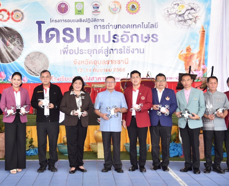 เมื่อวันที่ 12 กันยายน 2566 สำนักงานการวิจัยแห่งชาติ (วช.) กระทรวงการอุดมศึกษา วิทยาศาสตร์ วิจัยและนวัตกรรม พร้อมด้วย องค์การบริหารส่วนจังหวัดอุบลราชธานี และสมาคมกีฬาเครื่องบินจำลองและวิทยุบังคับ จัดกิจกรรมส่งเสริมและสนับสนุนการวิจัยและนวัตกรรม “การอบรมเชิงปฏิบัติการการถ่ายทอดเทคโนโลยีโดรนแปรอักษร เพื่อประยุกต์สู่การใช้งาน” ภาคตะวันออกเฉียงเหนือ ครั้ง 4 ระหว่างวันที่ 12 - 14 กันยายน 2566 โดยมี ดร.วิภารัตน์ ดีอ่อง ผู้อำนวยการสำนักงานการวิจัยแห่งชาติ เป็นประธานในพิธีเปิดการอบรมฯ พร้อมนี้ นายอิสสระ สมชัย อดีตรัฐมนตรีว่าการกระทรวงการพัฒนาสังคมและความมั่นคงของมนุษย์ ให้เกียรติเข้าร่วมงาน และ นายกานต์ กัลปัตินันท์ นายกองค์การบริหารส่วนจังหวัดอุบลราชธานี ได้กล่าวต้อนรับ ในพิธีเปิดงานคณะผู้บริหารหน่วยงานในพื้นที่ร่วมให้การต้อนรับ ณ โรงเรียนพิบูลมังสาหาร อำเภอพิบูลมังสาหาร จังหวัดอุบลราชธานี