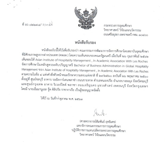 สถาบันการจัดการธุรกิจบริการและการโรงแรมแห่งเอเชียด้วยความร่วมมือกับเลส์โรชส์ (Asian Institute of Hospitality Management , In Academic Association With Les Roches) ได้มี หนังสือขอความอนุเคราะห์ให้นำข้อมูลของสถาบันฯ เผยแพร่ทางเว็บไซต์กระทรวงการอุดมศึกษา วิทยาศาสตร์ วิจัยและนวัตกรรม เพื่อเป็นการเผยแพร่ข้อมูลสู่สาธารณชน (รายละเอียดตามหนังสือ Asian Institute of Hospitality Management , In Academic Association With Les Roches ที่AIHM002/2023 ลงวันที่ 24 ตุลาคม 2566)