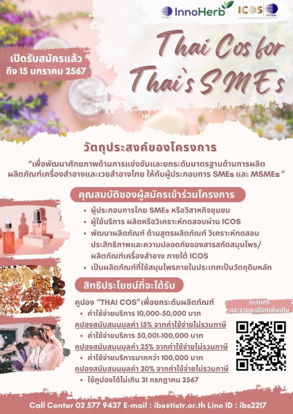 เปิดรับสมัคร SMEs ไทย ที่เคยเป็นลูกค้าของ วว. และมีผลิตภัณฑ์เครื่องสำอางที่ใช้ Ingredient Thai เป็นองค์ประกอบ ที่ประสงค์ต้องการวิจัยและพัฒนาสูตร วิเคราะห์ทดสอบประสิทธิภาพและความปลอดภัย รวมทั้งทดสอบกระบวนการผลิตเชิงอุตสาหกรรม เข้าร่วมสมัครเข้ารับคูปอง THAI COS โดยผู้ที่ได้รับการคัดเลือกจะได้รับสิทธิประโยชน์ทุนวิจัย เพื่อยกระดับผลิตภัณฑ์เครื่องสำอางโดยผู้เชี่ยวชาญด้าน Skin & Cosmetic technology