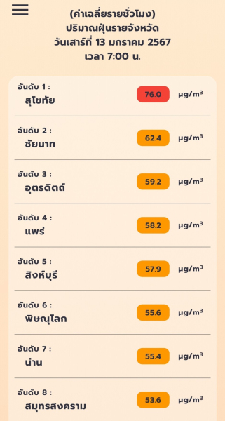 ในขณะที่ภาพรวมประเทศยังเกินมาตรฐานกว่า 20 จังหวัด โดยจังหวัดสุโขทัยเพียงจังหวัดเดียวที่มีระดับสีแดงและมีผลกระทบต่อระบบทางเดินหายใจและสุขภาพประชาชน