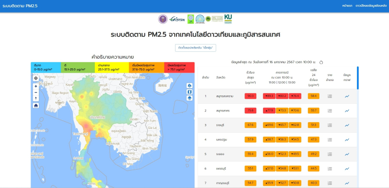 กระทรวง อว. โดย GISTDA ร่วมกับสำนักงานการวิจัยแห่งชาติ, กรมควบคุมมลพิษ, มหาวิทยาลัยเกษตรศาสตร์ และมหาวิทยาลัยเชียงใหม่ เกาะติดสถานการณ์ฝุ่น PM 2.5 แบบรายชั่วโมง ด้วยข้อมูลจากดาวเทียมผ่านแอปพลิเคชั่น “เช็คฝุ่น” เมื่อเวลา 10.00 น. ของวันที่ 16 มกราคม 2567 พบว่า 2 จังหวัด คือ #สมุทรสงคราม 90.3 ไมโครกรัม #สมุทรสาคร 75.8 ไมโครกรัม มีค่าฝุ่นเกินเกณฑ์มาตรฐานในระดับที่มีผลกระทบต่อสุขภาพสีแดง และ พบอีก 18 จังหวัด ที่มีค่าเกินเกณฑ์มาตรฐานในระดับที่เริ่มมีผลกระทบต่อสุขภาพสีส้ม โดย 3 อันดับแรกสีส้ม ได้แก่ #ราชบุรี 67.6 ไมโครกรัม #นครปฐม 57.9 ไมโครกรัม และ #ระยอง 55.4 ไมโครกรัม