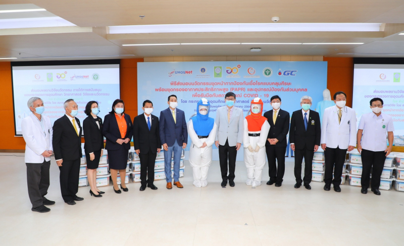 เมื่อวันที่ 21 มกราคม 2564 กระทรวงการอุดมศึกษา วิทยาศาสตร์ วิจัยและนวัตกรรม (อว.) ส่งมอบ “ชุดหน้ากากป้องกันเชื้อโรคแบบคลุมศีรษะพร้อมชุดกรองอากาศประสิทธิภาพสูง (PAPR) และอุปกรณ์ป้องกันส่วนบุคคลเพื่อรับมือกับสถานการณ์ COVID - 19” จากผลงานวิจัยที่ได้รับทุนสนับสนุนจากสำนักงานการวิจัยแห่งชาติ (วช.) และผลงานนวัตกรรมจากบริษัท พีทีที โกลบอล เคมิคอล จำกัด (มหาชน) “อุปกรณ์ป้องกันส่วนบุคคลเพื่อรับมือกับสถานการณ์ COVID - 19” ให้แก่เครือข่ายโรงพยาบาลกลุ่มสถาบันแพทยศาสตร์แห่งประเทศไทย (UHosNet) และกระทรวงสาธารณสุขรับมือการระบาดของไวรัสโคโรนาสายพันธุ์ใหม่ 2019 ณ ห้องจุฬาภรณ์ ตึกสยามินทร์ โรงพยาบาลศิริราช
