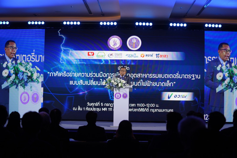 เมื่อวันที่ 5 ก.ค. นายศุภชัย ใจสมุทร ที่ปรึกษารองนายกรัฐมนตรี นายอนุทิน ชาญวีรกูล ได้รับมอบหมายจากนางสาวศุภมาส อิศรภักดี รัฐมนตรีว่าการกระทรวงการอุดมศึกษา วิทยาศาสตร์ วิจัยและนวัตกรรม (อว.) ให้เป็นประธานในพิธีเปิดตัว “ภาคีเครือข่ายความร่วมมือการพัฒนาอุตสาหกรรมแบตเตอรี่มาตรฐานแบบสับเปลี่ยนได้ สำหรับยานยนต์ไฟฟ้าขนาดเล็ก” ซึ่งจัดโดย สมาคมเทคโนโลยีระบบกักเก็บพลังงานไทย และเครือข่ายพันธมิตรภาครัฐและเอกชน ภายในงาน International Energy Storage Forum 2024 - TESTA Annual Symposium ครั้งที่ 4 โดยมีนายดนัยณัฏฐ์ โชคอำนวย ที่ปรึกษารัฐมนตรีว่าการกระทรวงอุตสาหกรรม ดร.สุมิตรา จรสโรจน์กุล ผู้อำนวยการศูนย์เทคโนโลยีพลังงานแห่งชาติ (เอ็นเทค) สำนักงานพัฒนาวิทยาศาสตร์และเทคโนโลยีแห่งชาติ (สวทช.) ดร.เกรียงศักดิ์ วงศ์พร้อมรัตน์ ผู้อำนวยการสถาบันยานยนต์ นายกฤษฎา อุตตโมทย์ นายกสมาคมยานยนต์ไฟฟ้าไทย และ ดร.พิมพา ลิ้มทองกุล นายกสมาคมเทคโนโลยีกักเก็บพลังงานไทย เข้าร่วม ณ ห้องประชุม MR 111 ศูนย์การประชุมแห่งชาติสิริกิติ์ กรุงเทพฯ