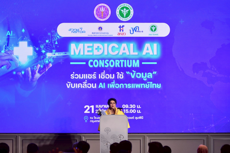 เมื่อวันที่ 21 เม.ย. น.ส.ศุภมาส อิศรภักดี รัฐมนตรีว่าการกระทรวงการอุดมศึกษา วิทยาศาสตร์ วิจัยและนวัตกรรม (อว.) เป็นประธานเปิดงานสัมมนาเชิงวิชาการ Medical AI Consortium: ร่วมแชร์ เชื่อม ใช้ “ข้อมูล” ขับเคลื่อน AI เพื่อการแพทย์ไทย และเป็นสักขีพยานในการประกาศความร่วมมือกับพันธมิตรทางการแพทย์ ซึ่งประกอบด้วย กรมการแพทย์ กระทรวงสาธารณสุข และคณะแพทยศาสตร์ โรงพยาบาลรามาธิบดี มหาวิทยาลัยมหิดล พร้อมด้วยภาคีเครือข่าย Medical AI Consortium ซึ่งภายในงานมีการเปิดตัว “แพลตฟอร์มข้อมูลกลางทางการแพทย์ (Medical AI Data Platform)” อย่างเป็นทางการ ที่มุ่งสร้างโครงสร้างพื้นฐานและระบบนิเวศข้อมูลที่เข้มแข็งรองรับการพัฒนานวัตกรรม AI ทางการแพทย์เพื่อคนไทย โดยมี พญ.เพชรดาว โต๊ะมีนา ที่ปรึกษารัฐมนตรีว่าการกระทรวง อว. ผศ.(พิเศษ) นายแพทย์ธนินทร์ เวชชาภินันท์ รองอธิบดีกรมการแพทย์ กระทรวงสาธารณสุข ศ.ดร.ชูกิจ ลิมปิจำนงค์ ผู้อำนวยการสำนักงานพัฒนาวิทยาศาสตร์และเทคโนโลยีแห่งชาติ (สวทช.) ศ.ดร.สมปอง คล้ายหนองสรวง ผู้อำนวยการสำนักงานคณะกรรมการส่งเสริม วิทยาศาสตร์ วิจัยและนวัตกรรม (สกสว.) ศ.นพ.ปิยะมิตร ศรีธรา อธิการบดีมหาวิทยาลัยมหิดล ดร.ชัย วุฒิวิวัฒน์ชัย ผู้อำนวยการเนคเทค สวทช. ดร.ณิรวัฒน์ ธรรมจักร์ ผู้อำนวยการหน่วยบริหารและจัดการทุนด้านการพัฒนากำลังคนและทุนด้านการพัฒนาสถาบันอุดมศึกษา การวิจัยและการสร้างนวัตกรรม (บพค.) และบุคลากรหน่วยงานที่เกี่ยวข้องเข้าร่วม ณ โรงแรมแกรนด์ เซ็นเตอร์พอยต์ ลุมพินี กทม.
