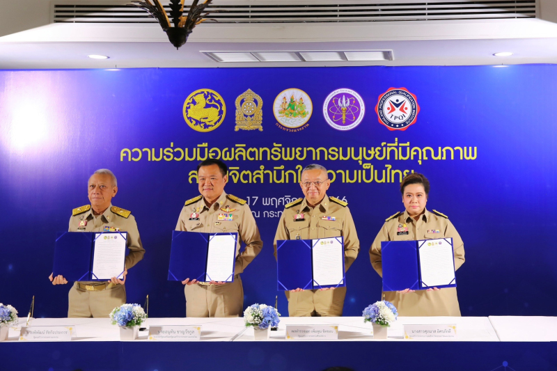 เมื่อวันที่ 17 พ.ย. นายอนุทิน ชาญวีรกูล รองนายกรัฐมนตรี และรัฐมนตรีว่าการกระทรวงมหาดไทย (มท.) เป็นประธานในการประชุม “การสร้างทรัพยากรมนุษย์ของชาติ เป็นคนที่มีจิตสำนึกรักชาติ ภาคภูมิใจในประวัติศาสตร์ของชาติไทย และยึดมั่นสถาบันสำคัญของชาติ” และพิธีลงนามบันทึกข้อตกลง “แนวทางการพัฒนาทรัพยากรมนุษย์ของประเทศไทย และการพิจารณาคัดเลือกบุคคลเข้ารับราชการ” โดยมี นางสาวศุภมาส อิศรภักดี รัฐมนตรีว่าการกระทรวงการอุดมศึกษา วิทยาศาสตร์ วิจัยและนวัตกรรม (อว.) พล.ต.อ.เพิ่มพูน ชิดชอบ รัฐมนตรีว่าการกระทรวงศึกษาธิการ (ศธ.) และนายพิพัฒน์ รัชกิจประการ รัฐมนตรีว่าการกระทรวงแรงงาน (รง.) พร้อมด้วย นางสาวสุชาดา แทนทรัพย์ เลขานุการ รมว.กระทรวง อว. นายเพิ่มสุข สัจจาภิวัฒน์ ปลัดกระทรวง อว. ศ.ดร.ศุภชัย ปทุมนากุล รองปลัดกระทรวง อว. รศ.ดร.พาสิทธิ์ หล่อธีรพงศ์ รองปลัดกระทรวง อว. รัฐมนตรีช่วยว่าการกระทรวงมหาดไทย กระทรวงศึกษาธิการ กระทรวงพาณิชย์ ผู้อำนวยการสถาบันคุณวุฒิวิชาชีพ (องค์การมหาชน) และผู้บริหารเข้าร่วมประชุม และพิธีลงนามบันทึกข้อตกลง “แนวทางการพัฒนาทรัพยากรมนุษย์ของประเทศไทย และการพิจารณาคัดเลือกบุคคลเข้ารับราชการ”