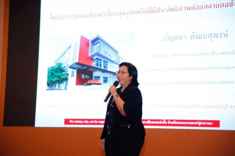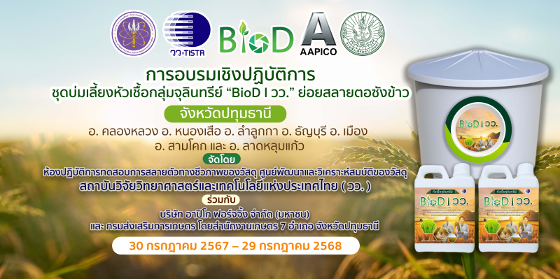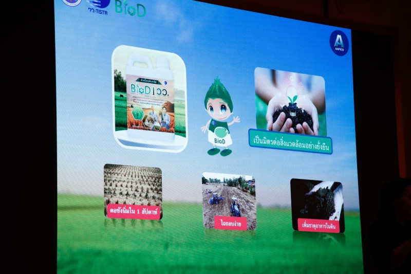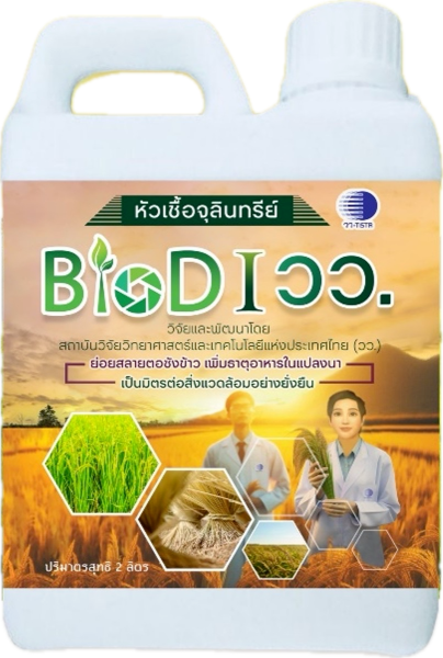 “...แนวทางหนึ่งในการแก้ปัญหานี้ วว. โดย ห้องปฏิบัติการทดสอบการสลายตัวทางชีวภาพของวัสดุ ประสบผลสำเร็จในการพัฒนากลุ่มจุลินทรีย์ BioD I (ไบโอดีวัน) วว. ที่มีประสิทธิภาพในการย่อยสลาย ทำให้ตอซังข้าวนิ่มภายในระยะเวลา 5-10 วัน ไถกลบได้ง่าย เพิ่มธาตุอาหารในแปลงนา ส่งเสริมเจริญเติบโตของข้าว และที่สำคัญเป็นมิตรต่อสิ่งแวดล้อม ทั้งนี้ วว. ได้ยื่นจดสิทธิบัตรการออกแบบชุดบ่มเลี้ยงหัวเชื้อ “BioD I วว.” ที่มีระบบให้อากาศและระบบควบคุมการทำงานแบบอัตโนมัติ สามารถผลิตหัวเชื้อจุลินทรีย์ฯ “BioD I วว.” ได้อย่างต่อเนื่อง ช่วยลดต้นทุนในการจัดการตอซังข้าว และเป็นมิตรต่อสิ่งแวดล้อมอย่างยั่งยืน...” ดร.จิตรา ชัยวิมล กล่าว