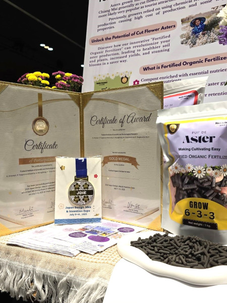 จุดเด่นผลงาน เป็นปุ๋ยอินทรีย์เคมี 2 สูตรที่เหมาะสำหรับใช้ในการผลิตแอสเทอร์ สูตร 6-3-3 เหมาะเป็นปุ๋ยรองพื้นเพื่อช่วงแรกของการเจริญเติบโต และสูตร 3-6-6 สำหรับเร่งดอกและเสริมสร้างความแข็งแรงของช่อดอก ที่ให้ปริมาณและคุณภาพผลผลิตสูง ลดปริมาณและความถี่ในการใช้ปุ๋ยเคมีที่น้อยกว่าวิธีดั้งเดิมของเกษตรกร ลดต้นทุนการผลิต พร้อมบำรุงดิน และเป็นมิตรต่อสิ่งแวดล้อม วว. ถ่ายทอดเทคโนโลยีให้กับ วิสาหกิจชุมชนผู้ผลิตไม้ดอกไม้ประดับตำบลเหมืองแก้ว และ I love flower farm อำเภอแม่ริม จังหวัดเชียงใหม่
