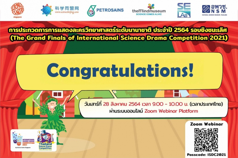องค์การพิพิธภัณฑ์วิทยาศาสตร์แห่งชาติ (อพวช.) กระทรวงการอุดมศึกษา วิทยาศาสตร์ วิจัยและนวัตกรรม ส่งตัวแทนเยาวชนจากประเทศไทยเข้าร่วม “การประกวดการแสดงละครวิทยาศาสตร์ระดับนานาชาติ ประจำปี 2564” (International Science Drama Competition 2021) ซึ่งเยาวชนไทยสามารถคว้ารางวัลมาได้ถึง 5 รางวัล สำหรับโดยตัวแทนเยาวชนในครั้งนี้ คือทีมเยาวชนที่ได้รับรางวัลชนะเลิศอันดับที่ 1 – 3 จากการประกวดโครงการการแสดงละครวิทยาศาสตร์ ประจำปี 2564 ภายใต้หัวข้อ “การเกษตรแบบยั่งยืนเพื่ออนาคตที่ดีกว่า” (Sustainable Agriculture for a Better Future) ที่ อพวช. จัดขึ้น เพื่อเปิดโอกาส ให้เยาวชนได้แสดงออกถึงความสามารถด้านการสื่อสารวิทยาศาสตร์ผ่านการแสดงละคร และกระตุ้นให้เยาวชนนำวิทยาศาสตร์ (Science) และศิลปะ (Art) ผนวกเข้าด้วยกัน เพื่อสร้างสรรค์ผลงานการสื่อสารวิทยาศาสตร์ในรูปแบบของละครวิทยาศาสตร์ รวมทั้ง สร้างประสบการณ์ให้เยาวชนไทยได้แสดงผลงานใน เวทีระดับนานาชาติ