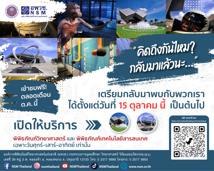 8 ตุลาคม 2564 - ปทุมธานี / องค์การพิพิธภัณฑ์วิทยาศาสตร์แห่งชาติ (อพวช.) กระทรวงการอุดมศึกษา วิทยาศาสตร์ วิจัยและนวัตกรรม (อว.) พร้อมกลับมาเปิดให้บริการพิพิธภัณฑ์อีกครั้ง 15 ต.ค. นี้ โดยใน ช่วงแรกเปิดให้บริการ 2 พิพิธภัณฑ์ เฉพาะวันศุกร์ เสาร์ และอาทิตย์ ได้แก่ พิพิธภัณฑ์วิทยาศาสตร์ และพิพิธภัณฑ์เทคโนโลยีสารสนเทศ ณ ต.คลองห้า อ.คลองหลวง จ.ปทุมธานี สำหรับจัตุรัสวิทยาศาสตร์ อพวช. เดอะ สตรีท รัชดา กรุงเทพฯ เปิดให้เข้าชมทุกวันตั้งแต่วันนี้เป็นต้นไป พิเศษ! ต้อนรับการกลับมา เปิดให้เข้าชมฟรี! ตลอดเดือนตุลาคม 2564 นี้