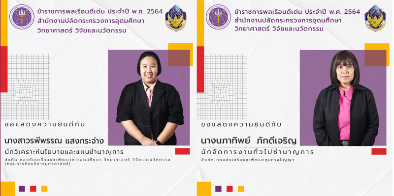 ผลการคัดเลือกข้าราชการพลเรือนดีเด่น ประจำปี พ.ศ. 2564 ของสำนักงานปลัดกระทรวงการอุดมศึกษา วิทยาศาสตร์ วิจัยและนวัตกรรม (สป.อว.) จำนวน 2 ราย ดังนี้