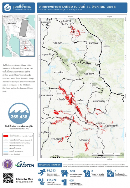 GISTDA เปิดภาพจากดาวเทียม Sentinel-1 (เซนติเนล-1) ติดตามสถานการณ์น้ำท่วมในพื้นที่บางส่วนของลุ่มน้ำชี ลุ่มน้ำมูล และลุ่มน้ำโขงตะวันออกเฉียงเหนือ วันที่ 31 สิงหาคม 2565 พบพื้นที่น้ำท่วม ทั้งสิ้น 369,438 ไร่ พื้นที่ปลูกข้าวได้รับผลกระทบ 213,472 ไร่ ในพื้นที่บางส่วนของจังหวัด #ร้อยเอ็ด #สุรินทร์ #ยโสธร #ศรีสะเกษ #นครพนม #อุบลราชธานี #สกลนคร #อำนาจเจริญ #กาฬสินธุ์ #บึงกาฬ และ #บุรีรัมย์ โดยส่วนใหญ่เป็นพื้นที่เกษตรกรรมในพื้นที่ลุ่มต่ำริมสองฝั่งแม่น้ำสายหลักและสายรองของพื้นที่โดยรอบ ซึ่งรวมถึงชุมชนที่อยู่อาศัยและเส้นทางคมนาคมบางส่วน