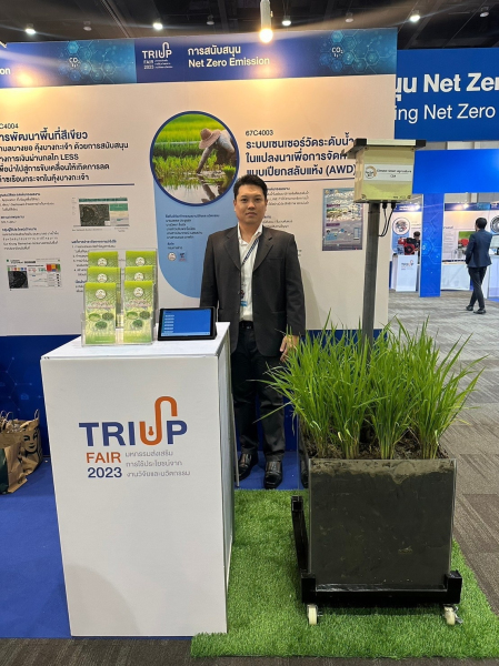 นายนพดล ประยูรสุข ผู้อำนวยการศูนย์วิจัยข้าวพระนครศรีอยุธยา เปิดเผยถึงการพัฒนาระบบเซนเซอร์วัดระดับน้ำในแปลงนาเพื่อการจัดการน้ำแบบเปียกสลับแห้ง (AWD) ซึ่งนำมาจัดแสดงในงาน TRIUP FAIR 2023 มหกรรมส่งเสริมการใช้ประโยชน์จากงานวิจัยและนวัตกรรม 2566 ว่าระบบเซนเซอร์ดังกล่าวเป็นอุปกรณ์ช่วยสนับสนุนการจัดการน้ำแบบเปียกสลับแห้งในการผลิตข้าวพื้นที่นาชลประทาน ซึ่งเป็นเทคโนโลยีการจัดการน้ำในแปลงนาที่กรมการข้าวดำเนินการวิจัยและเผยแพร่มาอย่างต่อเนื่อง โดยอุปกรณ์ดังกล่าวเป็นตัวต้นแบบที่พร้อมเผยแพร่สู่การนำไปใช้ประโยชน์ ปัจจุบันได้นำมาทดสอบใช้ในแปลงวิจัยศูนย์ข้าว ศูนย์ข้าวชุมชน และนาแปลงใหญ่จังหวัดฉะเชิงเทรา สุพรรณบุรี และปทุมธานี ทั้งนี้อยู่ระหว่างการเตรียมข้อมูลสำหรับจดอนุสิทธิบัตรทรัพย์สินทางปัญญาเป็นผลงานของกรมการข้าว