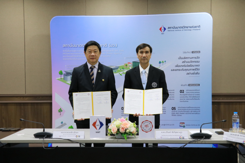 (4 มกราคม 2567) พล.ต.ท.นพ.พรชัย สุธีรคุณ ผู้อำนวยการ มว. นายอนุสรณ์ ทนหมื่นไวย รองผู้อำนวยการ ดร.จรัญ ยะฝา ผู้ช่วยผู้อำนวยการ พร้อมด้วยหัวหน้าฝ่าย หัวหน้ากลุ่มงาน และนักมาตรวิทยา ฝ่ายมาตรวิทยาเคมีและชีวภาพ ให้การต้อนรับ ศ.ดร.ปรินทร์ ชัยวิสุทธางกูร คณบดีคณะวิทยาศาสตร์ มหาวิทยาลัยศรีนครินทรวิโรฒ และทีมในโอกาส เข้าร่วมในพิธีลงนามบันทึกข้อตกลงความร่วมมือทางวิชาการเพื่อการพัฒนาระบบมาตรวิทยาระหว่างสถาบันมาตรวิทยาแห่งชาติ (มว.) กระทรวงการอุดมศึกษา วิทยาศาสตร์ วิจัยและนวัตกรรม กับ มหาวิทยาลัยศรีนครินทรวิโรฒ โดยมีวัตถุประสงค์เพื่อร่วมกันจัดกิจกรรมทางวิชาการเพื่อพัฒนาหลักสูตรระยะสั้น หรือหลักสูตรการอบรมด้านมาตรวิทยา ให้แก่นิสิตและบุคลากรของ มศว รวมถึงบุคคลทั่วไปที่สนใจ ร่วมกันพัฒนางานวิจัยด้านมาตรวิทยาและการถ่ายทอดเทคโนโลยีดังกล่าวให้กับภาการศึกษาและอุตสาหกรรม ร่วมกันสนับสนุนการพัฒนาบุคลากรของทั้งสองฝ่าย ให้มีศักยภาพตามที่จะตกลงกัน รวมทั้งสถาบันจะเป็นหน่วยงานในการให้คำแนะนำ ในการบริหารจัดการห้องปฏิบัติการ วิเคราะห์ ทดสอบและสอบเทียบอีกด้วย โดยกิจกรรมการลงนามบันทึกข้อตกลงดังกล่าวจัดขึ้น ณ สถาบันมาตรวิทยาแห่งชาติ (มว.) คลองห้า จังหวัดปทุมธานี