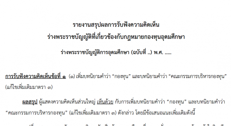 เอกสาร รายงานสรุปผลการรับฟังความคิดเห็น ร่างพระราชบัญญัติที่เกี่ยวข้องกับกฎหมายกองทุนอุดมศึกษา ร่างพระราชบัญญัติการอุดมศึกษา (ฉบับที่ ..) พ.ศ. ..... และ