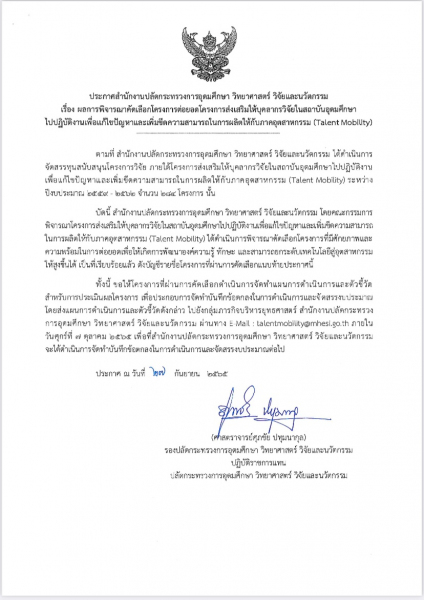 สำนักงานปลัดกระทรวงการอุดมศึกษา วิทยาศาสตร์ วิจัยและนวัตกรรมการ ประกาศผลการพิจารณาคัดเลือกโครงการต่อยอดโครงการส่งเสริมให้บุคลากรวิจัยในสถาบันอุดมศึกษาไปปฏิบัติงานเพื่อแก้ไขปัญหาและเพิ่มขีดความสามารถในการผลิตให้กับภาคอุตสาหกรรม (Talent Mobility)
