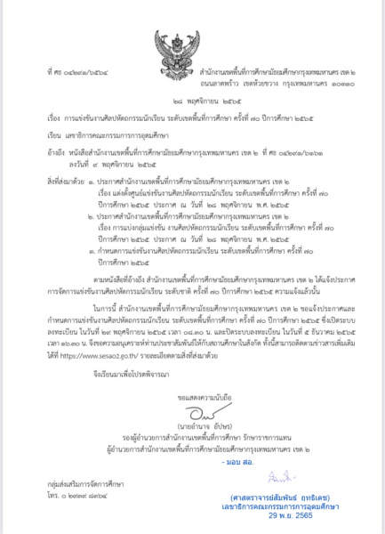 1. ประกาศสำนักงานเขตพื้นที่การศึกษามัธยมศึกษากรุงเทพมหานคร เขต 2 เรื่อง แต่งตั้งศูนย์แข่งขันงานศิลปหัตถกรรมนักเรียน ระดับเขตพื้นที่การศึกษา ครั้งที่ 70 ปีการศึกษา 2565 ประกาศ ณ วันที่ 28 พฤศจิกายน พ.ศ. 2565