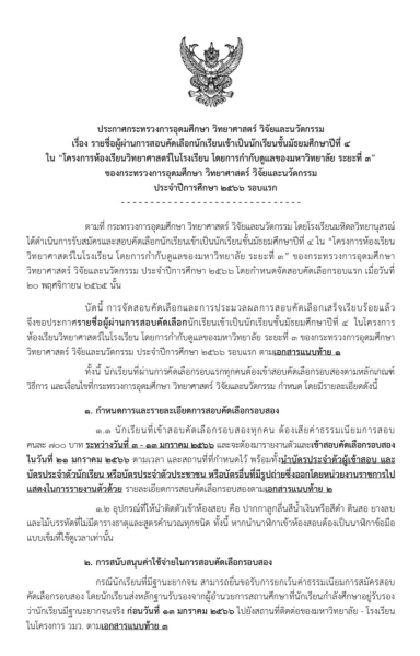 ตามที่โครงการ วมว. ได้ดำเนินการสอบคัดเลือกนักเรียน รอบแรก ประจำปีการศึกษา 2566 เมื่อวันที่ 12 กรกฎาคม 2565 บัดนี้ การจัดสอบคัดเลือกและการประมวลผลการสอบคัดเลือกเสร็จเรียบร้อยแล้ว จึงขอประกาศรายชื่อผู้ผ่านการสอบคัดเลือกนักเรียนเข้าเป็นนักเรียนชั้นมัธยมศึกษาปีที่ 4 ในโครงการห้องเรียนวิทยาศาสตร์ในโรงเรียน โดยการกำกับดูแลของมหาวิทยาลัย ระยะที่ 3 ของกระทรวงการอุดมศึกษา วิทยาศาสตร์ วิจัยและนวัตกรรม ประจำปีการศึกษา 2566 โดยมีรายละเอียดตามประกาศและรายชื่อผู้สอบผ่านการคัดเลือกรอบแรก ดังเอกสารแนบท้าย