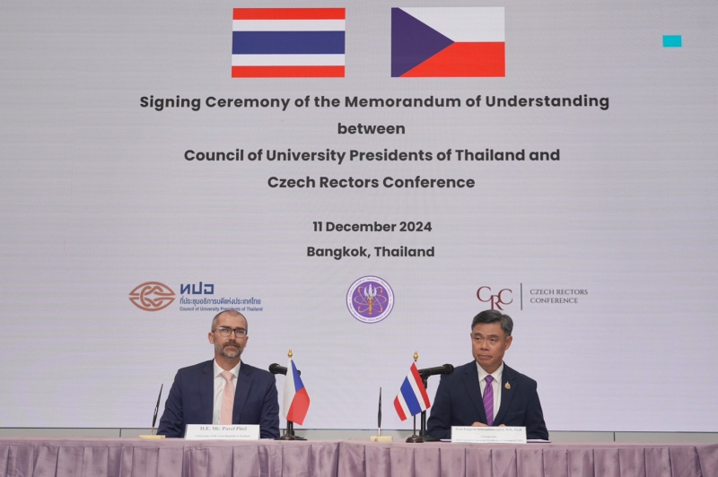 เมื่อวันที่ 11 ธันวาคม 2567 สำนักงานปลัดกระทรวงการอุดมศึกษา วิทยาศาสตร์ วิจัยและนวัตกรรม โดยกองการต่างประเทศ เป็นเจ้าภาพจัดพิธีลงนามบันทึกความเข้าใจระหว่างที่ประชุมอธิการบดีแห่งประเทศไทยและ Czech Rectors Conference โดยมีศาสตราจารย์ นายแพทย์พงษ์รักษ์ ศรีบัณฑิตมงคล ประธานที่ประชุมอธิการบดีแห่งประเทศไทย และ H.E. Mr. Pavel Pitel เอกอัครราชทูตสาธารณรัฐเช็กประจำประเทศไทย เป็นผู้ลงนามในบันทึกความเข้าใจดังกล่าว ณ ห้องแถลงข่าวชั้น 1 อาคารพระจอมเกล้า สำนักงานปลัดกระทรวงการอุดมศึกษา วิทยาศาสตร์ วิจัยและนวัตกรรม (ถนนโยธี)