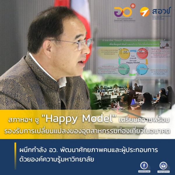 ด้าน ดร.กิติพงค์ พร้อมวงค์ ผู้อำนวยการ สอวช. กล่าวชื่นชมแพลตฟอร์มแฮปปี้ โมเดล ของสภาหอการค้า ที่มีการวางแนวทางดำเนินงานเตรียมความพร้อมเพื่อรองรับการเปลี่ยนแปลงของอุตสาหกรรมการท่องเที่ยวในอนาคต ที่จะเน้น Medical and Wellness Tourism มากขึ้น และมองว่าการพัฒนาศักยภาพคนและผู้ประกอบการตามแฮปปี้ โมเดล ทางกระทรวง อว. สามารถร่วมมือได้ในการจัดหลักสูตรอบรมระยะสั้นทั้งในส่วนการให้การรับรองทางวิชาชีพ ตลอดจนการ Upskill Reskill บ่มเพาะ ฝึกทักษะการประกอบวิชาชีพรูปแบบใหม่ที่เกี่ยวกับการท่องเที่ยวและการบริการให้เหมาะสมกับบุคลากรแต่ละพื้นที่ ด้วยการใช้องค์ความรู้ของมหาวิทยาลัยมาช่วย เข้ามาเป็นพี่เลี้ยงให้กับชุมชน อีกทั้งในส่วนของหน่วยบริหารและจัดการทุนด้านการพัฒนาระดับพื้นที่ (บพท.) ก็มีประสบการณ์ในการทำวิจัยในพื้นที่ มีเครือข่ายที่ทำงานในพื้นที่จำนวนมากที่สามารถนำข้อมูลมาแลกเปลี่ยนและต่อยอดได้
