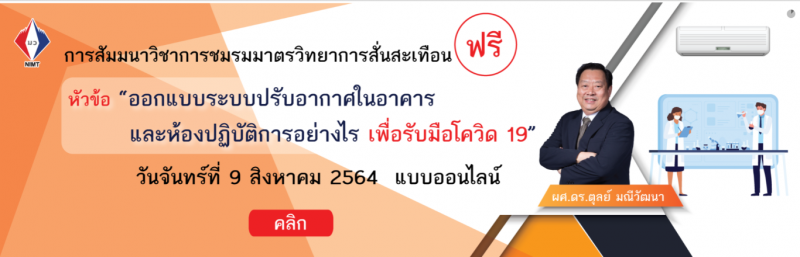 ชมรมมาตรวิทยาการสั่นสะเทือน สถาบันมาตรวิทยาแห่งชาติ (มว.) จัดสัมมนาวิชาการหัวข้อ “ออกแบบระบบปรับอากาศในอาคารและห้องปฏิบัติการอย่างไร เพื่อรับมือโควิด 19” จุดประสงค์เพื่อเผยแพร่ความรู้แนวทางการออกแบบและปรับปรุงระบบปรับอากาศสำหรับห้องปฏิบัติการสอบเทียบ ห้องปฏิบัติการทดสอบ และอาคารสำนักงาน รวมถึงการออกแบบห้องความดันลบ เพื่อรับมือสถานะการโควิด 19 บรรยายให้ความรู้แก่สมาชิกชมรม และผู้สนใจ โดยผู้ช่วยศาสตราจารย์ ดร.ตุลย์ มณีวัฒนา ซึ่งท่านเป็นวุฒิวิศวกรในสาขาวิศวกรรมเครื่องกลที่มีประสบการณ์ในการออกแบบระบบปรับอากาศ ระบายอากาศ และระบบเครื่องทำความเย็นขนาดใหญ่ ในอาคารและโรงงานต่างๆ มากว่า 30 ปี ท่านเป็นอาจารย์ที่ภาควิชาวิศวกรรมเครื่องกล คณะวิศวกรรมศาสตร์ จุฬาลงกรณ์มหาวิทยาลัย มาตั้งแต่ปี พศ. 2523 รายวิชาที่ท่านสอนอยู่ส่วนมากคือรายวิชาการทำความเย็นและการปรับอากาศสำหรับนักศึกษาในภาควิชาวิศวกรรมเครื่องกลชั้นปีที่ 4 และรายวิชาการทำความเย็นและการปรับอากาศขั้นสูงสำหรับนักศึกษาในระดับปริญญาโท/เอก และท่านก็ยังได้รับเลือกจากสมาคมวิศวกรรมปรับอากาศแห่งประเทศไทย ให้เป็น วิศวกรปรับอากาศดีเด่นประจำปี 2560 อีกด้วย การจัดสัมมนาในครั้งนี้เป็นกิจกรรมภายใต้ชมรมมาตรวิทยาการสั่นสะเทือน และเป็นการจัดแบบออนไลน์ ณ สถาบันมาตรวิทยาแห่งชาติ (มว.) จ.ปทุมธานี