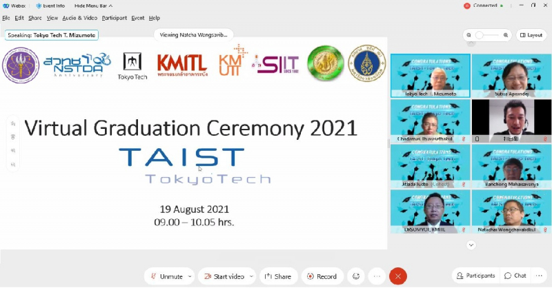 (19 ส.ค. 64) โครงการทุนสถาบันวิทยาศาสตร์และเทคโนโลยีขั้นสูงแห่งประเทศไทย และสถาบันเทคโนโลยีแห่งโตเกียว โดยสำนักงานพัฒนาวิทยาศาสตร์และเทคโนโลยีแห่งชาติ (สวทช.) ภายใต้กระทรวงการอุดมศึกษา วิทยาศาสตร์ วิจัยและนวัตกรรม (อว.) ร่วมกับ สถาบันเทคโนโลยีแห่งโตเกียว (Tokyo Institute of Technology) และมหาวิทยาลัยไทย 4 แห่ง ได้แก่ สถาบันเทคโนโลยีพระจอมเกล้าเจ้าคุณทหารลาดกระบัง (สจล.) มหาวิทยาลัยเทคโนโลยีพระจอมเกล้าธนบุรี (มจธ.) สถาบันเทคโนโลยีนานาชาติสิรินธร มหาวิทยาลัยธรรมศาสตร์ มหาวิทยาลัยเกษตรศาสตร์ และมหาวิทยาลัยมหิดล จัดพิธีจบการศึกษาในรูปแบบออนไลน์ “TAIST – Tokyo Tech Virtual Graduation Ceremony 2021” เพื่อแสดงความยินดีแก่มหาบัณฑิตนักเรียนทุน TAIST-Tokyo Tech ประจำปี 2564 โดยมี ดร.ชฎามาศ ธุวะเศรษฐกุล รองผู้อำนวยการ สวทช. เป็นประธานกล่าวเปิดงาน และร่วมแสดงความยินดี พร้อมด้วยตัวแทนจากหน่วยงานพันธมิตรที่มีบทบาทสำคัญในการสนับสนุนความสำเร็จครั้งนี้ โดยในปีมีนักเรียนทุน TAIST-Tokyo Tech ที่จบการศึกษาทั้งสิ้น 14 คน จาก 3 หลักสูตร ได้แก่ 1.หลักสูตรวิศวกรรมยานยนต์ (AE: Automotive Engineering) 2.หลักสูตรเทคโนโลยีสารสนเทศและการสื่อสารเพื่อระบบสมองกลฝังตัว (ICTES: Information and Communication Technology for Embedded Systems ) 3.หลักสูตรวิศวกรรมพลังงานและทรัพยากรเพื่อความยั่งยืน (SERE: Sustainable Energy and Resources Engineering) โดยมีนักเรียนทุน 5 คนจาก 14 คนที่ได้รับประกาศนียบัตรในหลักสูตรประกาศนียบัตรระบบขนส่งระบบรางอีกด้วย