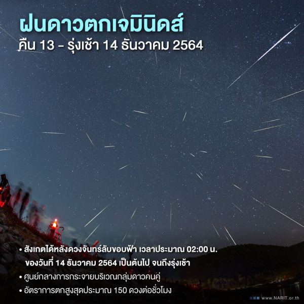 สถาบันวิจัยดาราศาสตร์แห่งชาติ (องค์การมหาชน) (สดร.) กระทรวงการอุดมศึกษา วิทยาศาสตร์ วิจัยและนวัตกรรม (อว.) เผยคืน 13 - รุ่งเช้า 14 ธ.ค. 64 มีปรากฏการณ์ “ฝนดาวตกเจมินิดส์” คาดอัตราการตกสูงสุดประมาณ 150 ดวงต่อชั่วโมง ปีนี้มีแสงจันทร์รบกวนในช่วงแรก แนะสังเกตหลังดวงจันทร์ลับขอบฟ้า เวลา 02:00 น. ของวันที่ 14 ธ.ค. 64 เป็นต้นไปจนถึงรุ่งเช้า  หากฟ้าใสไร้เมฆ ชมด้วยตาเปล่าได้ทั่วไทยในพื้นที่มืดไร้แสงรบกวน