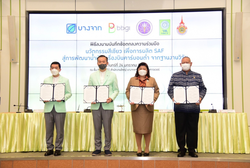 วันนี้ (24 ม.ค. 65) สำนักงานการวิจัยแห่งชาติ (วช.) กระทรวงการอุดมศึกษา วิทยาศาสตร์ วิจัยและนวัตกรรม ร่วมกับ บริษัท บางจาก จำกัด (มหาชน) บริษัท บีบีจีโอ จำกัด (มหาชน) และ มหาวิทยาลัยเทคโนโลยีราชมงคลอีสาน ลงนามบันทึกข้อตกลงความร่วมมือในการขับเคลื่อน “นวัตกรรมสีเขียว เพื่อการผลิต  SAF สู่การพัฒนาน้ำมันเครื่องบินคาร์บอนต่ำ จากฐานงานวิจัย" ณ ห้องใบไม้ ชั้น 8 อาคาร เอ็ม ทาวเวอร์ สำนักงานใหญ่ บริษัท บางจาก คอร์ปอเรชั่น จำกัด (มหาชน) กรุงเทพฯ