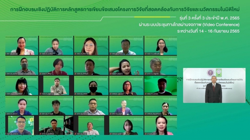 เมื่อวันที่ 14 - 16 กันยายน 2565 สำนักงานการวิจัยแห่งชาติ (วช.) กระทรวงการอุดมศึกษา วิทยาศาสตร์ วิจัยและนวัตกรรม จัดการฝึกอบรมเชิงปฏิบัติการ “หลักสูตรการเขียนข้อเสนอโครงการวิจัยที่สอดคล้องกับการวิจัยและนวัตกรรมในมิติใหม่ รุ่นที่ 3 ครั้งที่ 3 ประจำปี พ.ศ. 2565” โดยมี นายสมปรารถนา สุขทวี รองผู้อำนวยการสำนักงานการวิจัยแห่งชาติ เป็นประธานเปิดการฝึกอบรมฯ ณ ศูนย์จัดการความรู้และถ่ายทอดผลงานวิจัย สำนักงานการวิจัยแห่งชาติ ผ่านระบบประชุมทางไกลผ่านจอภาพ (Video Conference)