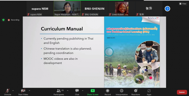 11 พ.ย. 65 / ดร.สุภรา กมลพัฒนะ ผู้อำนวยการกองส่งเสริมการเรียนรู้ และนางสาวนภัทร มาลาธรรม นักวิชาการ องค์การพิพิธภัณฑ์วิทยาศาสตร์แห่งชาติ(อพวช.)ร่วมประชุมงาน "The Belt and Road" Professional Development Center for Environmental Education, 9th China Nature Education Forum พร้อมนำเสนอผลงานในหัวข้อ A Problem-Based Learning (PBL) Ecology Curriculum on Water Resources: A Thai-Chinese Collaborative Project ผ่านทางออนไลน์