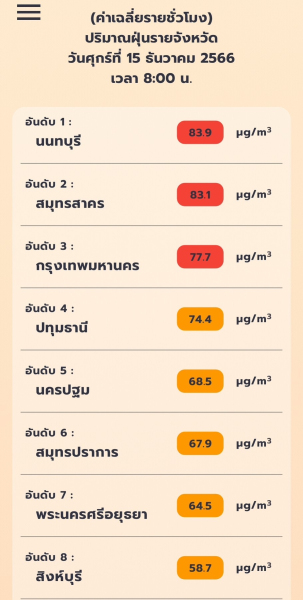 GISTDA เกาะติดสถานการณ์ฝุ่น PM 2.5 แบบรายชั่วโมง ด้วยข้อมูลจากดาวเทียมผ่านแอปพลิเคชั่น “เช็คฝุ่น” เมื่อเวลา 08.00 น. ของวันที่ 15 ธันวาคม 2566 พบว่า3 จังหวัด ได้แก่นนทบุรี สมุทรสาคร และกทม. มีค่าฝุ่นเกินมาตรฐานและส่งผลกระทบต่อสุขภาพระดับสีแดง อยู่ที่ 83.9, 83.1 และ 77.7 ไมโครกรัมตามลำดับ ในขณะที่อีก 32 จังหวัด เกินค่ามาตรฐานระดับสีส้มที่เริ่มส่งผลต่อสุขภาพ