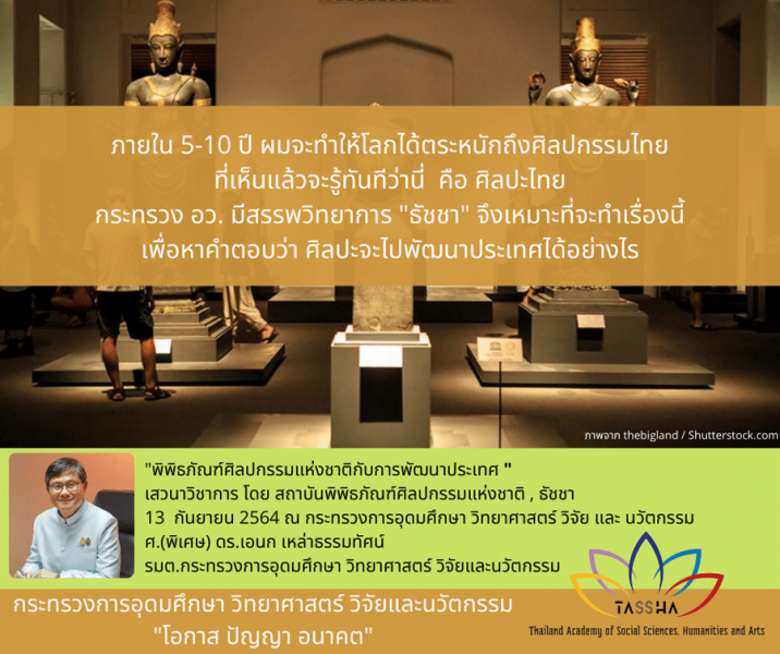 เมื่อวันที่ 13 กันยายน 2564 ศาสตราจารย์พิเศษ ดร.เอนก เหล่าธรรมทัศน์ รัฐมนตรีว่าการกระทรวงการอุดมศึกษา วิทยาศาสตร์ วิจัยและนวัตกรรม เป็นประธานการเสวนาวิชาการ “พิพิธภัณฑ์ศิลปกรรมแห่งชาติกับการพัฒนาประเทศ” โดย สถาบันพิพิธภัณฑ์ศิลปกรรมแห่งชาติ สำนักงานวิทยสถานสังคมศาสตร์ มนุษยศาสตร์และศิลปกรรมศาสตร์แห่งประเทศไทย (ธัชชา) โดยมี ศาสตราจารย์ ดร.นพ.สิริฤกษ์ ทรงศิวิไล ปลัดกระทรวงการอุดมศึกษาฯเข้าร่วมงาน โดยได้รับเกียรติวิทยากรพิเศษจาก V&A Museum , London มาแบ่งปันประสบการณ์ในการจัดการพิพิธภัณฑ์ระดับโลกด้วย