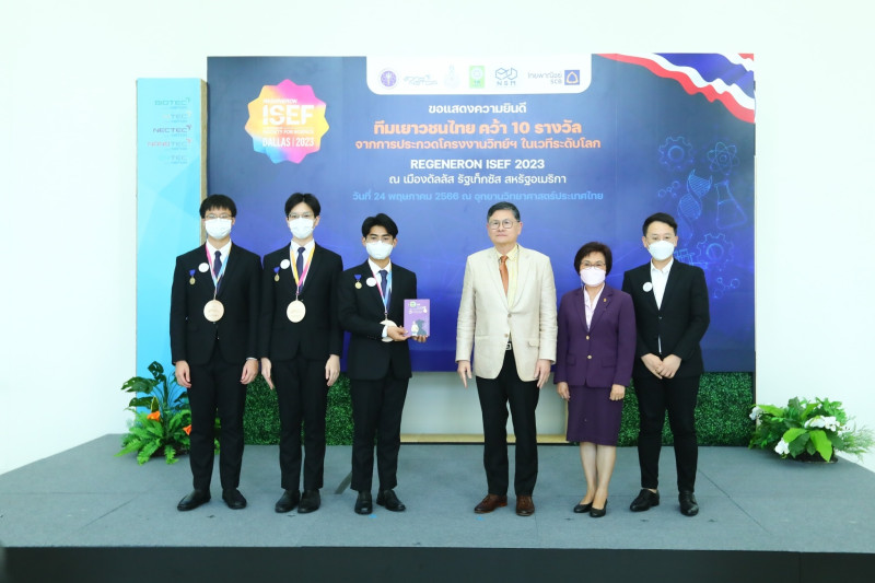 เมื่อวันที่ 24 พ.ค. ศ.(พิเศษ) ดร.เอนก เหล่าธรรมทัศน์ รมว.อุดมศึกษา วิทยาศาสตร์ วิจัยและนวัตกรรม (อว.) ร่วมแสดงความยินดีพร้อมมอบโอวาทแก่คณะเยาวชนไทยที่คว้ารางวัลสร้างชื่อในเวทีโลกจากการประกวดโครงงานวิทยาศาสตร์และวิศวกรรมศาสตร์สำหรับเยาวชน ระดับโลก REGENERON ISEF 2023 ณ เมืองดัลลัส รัฐเท็กซัส ประเทศสหรัฐอเมริกา โดยมี ศ.ดร.นพ.สิริฤกษ์ ทรงศิวิไล ปลัดกระทรวง อว. ผศ.ดร.รวิน ระวิวงศ์ ผู้อำนวยการองค์การพิพิธภัณฑ์วิทยาศาสตร์แห่งชาติ (อพวช.) หรือ NSM ดร.จุฬารัตน์ ตันประเสริฐ รองผู้อำนวยการสำนักงานพัฒนาวิทยาศาสตร์และเทคโนโลยีแห่งชาติ ( สวทช.) นางสาวสตตกมล เกียรติพานิช ผู้อำนวยการกองบริหารทุนวิจัยและนวัตกรรม 2 สำนักงานการวิจัยแห่งชาติ (วช.) รศ.ดร.ธณัฏฐ์คุณ มงคลอัศวรัตน์ นายกสมาคมวิทยาศาสตร์แห่งประเทศไทย ในพระบรมราชูปถัมภ์ และนางสาวอารยา ภู่พานิช รองผู้จัดการใหญ่ ผู้บริหารสายงานกิจกรรมเพื่อสังคม ธนาคารไทยพาณิชย์ จำกัด (มหาชน) เข้าร่วมแสดงความยินดี ที่ห้องโถงนิทรรศการ อาคาร 12 อุทยานวิทยาศาสตร์ประเทศไทย จ.ปทุมธานี